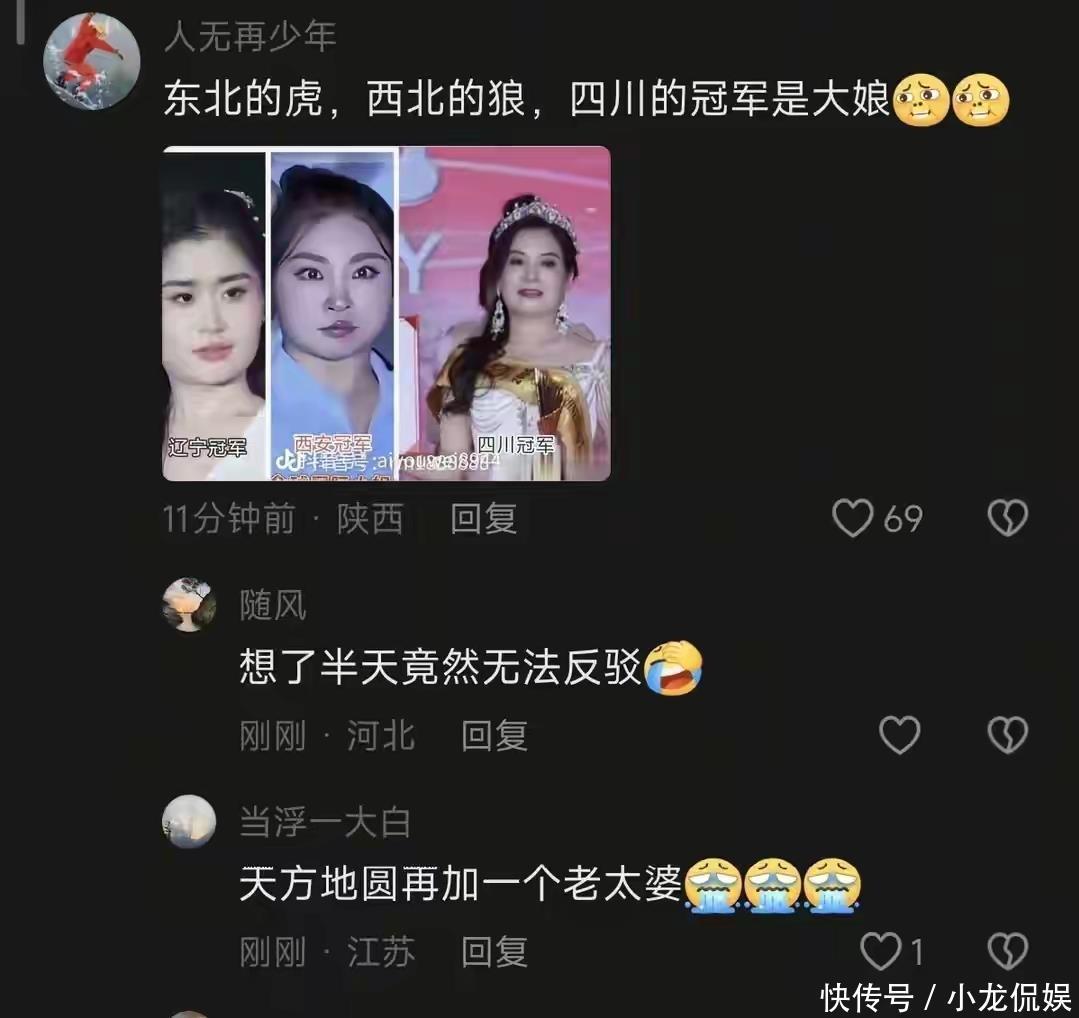 可别光盯着辽宁笑。这届其他赛区也好不到哪去。西安冠军被吐槽“像刚下夜班的保安”,四川冠军直接被喊“大娘”——网友戏称:东北的虎,西北的狼,四川冠军是亲娘。这哪是选美?简直是“审丑”!大家不是非要盯着“白瘦幼”不放,也不是反对多元审美。但选美比赛可以包容不同风格,可以打破刻板印象,可底线不能没有。冠军可以不完美,但不能“不达标”。问题是:明明有那么多条件出众的东北姑娘,为啥偏偏选了个争议不断的“路人款”?明明要代表一方水土的形象,为啥找个连本地人都不认的“外乡人”凑数?这背后,是审美降级?还是规则失守?网友一句扎心总结:不管你们跟东北人有多大仇,这次,算是彻底报了。[免责声明]文章的时间、过程、图片均来自于网络,文章旨在传播正能量,均无低俗等不良引导,请观众勿对号入座,并上升到人身攻击等方面。观众理性看待本事件,切勿留下主观臆断的恶意评论,互联网不是法外之地。本文如若真实性存在争议、事件版权或图片侵权问题,请及时联系作者,将予以删除。谢谢!
